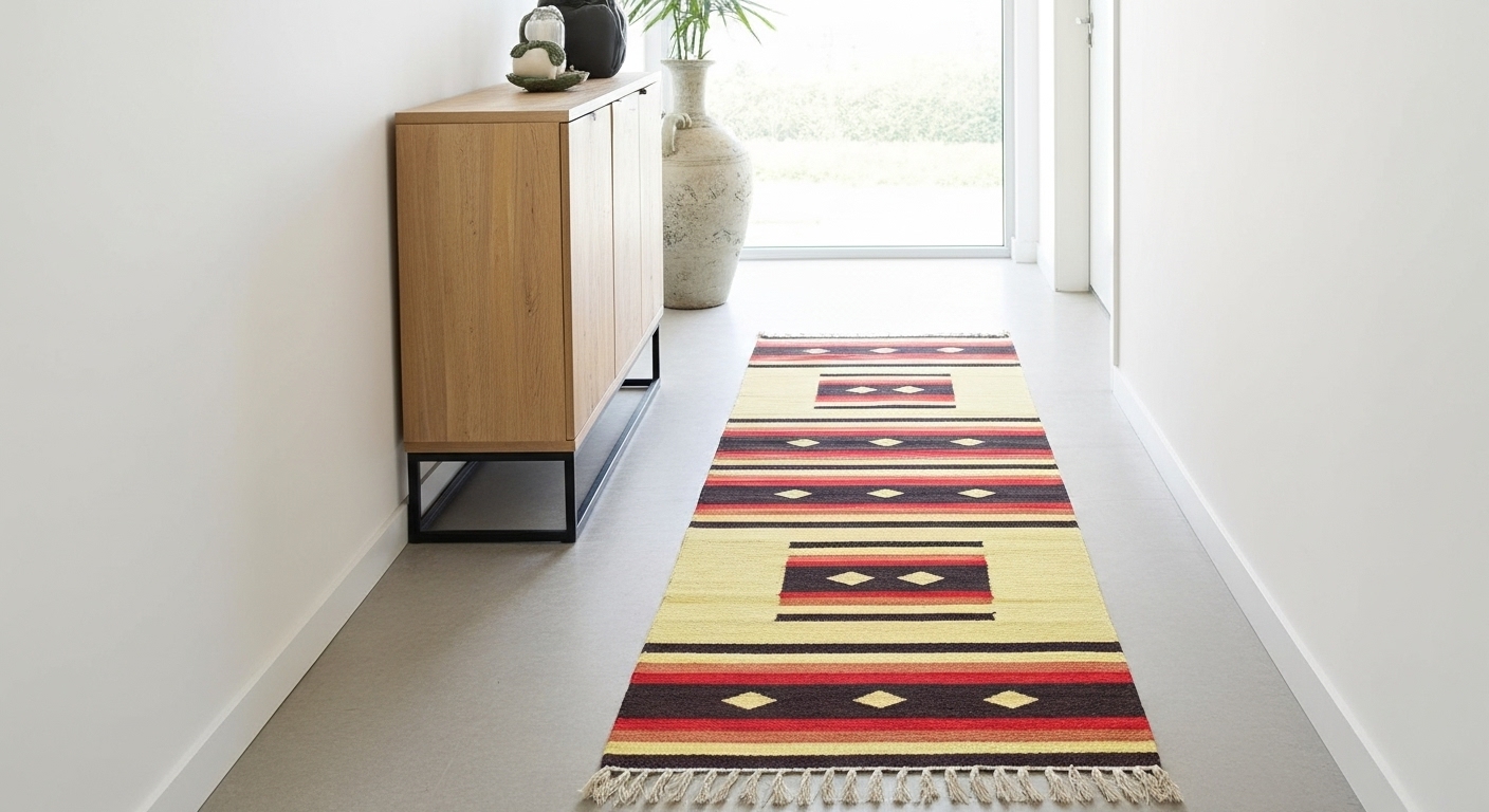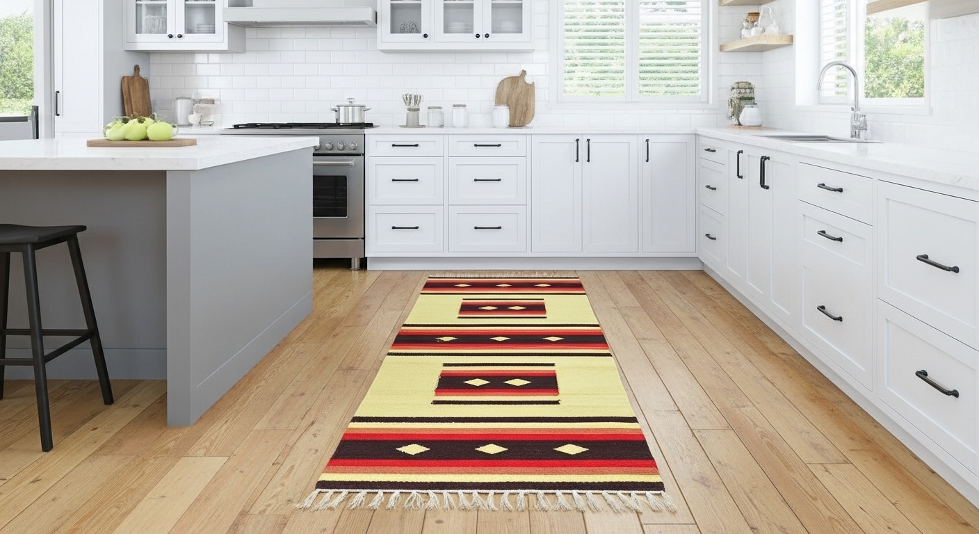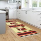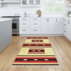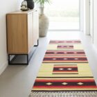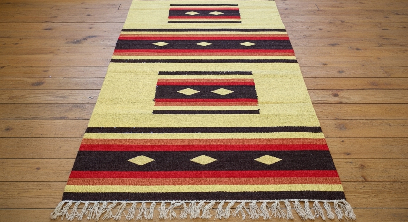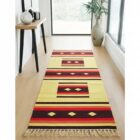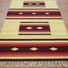 Beautiful Handloomed geomatric rug in golden buttercup hues imbue the rug with a glowing warmth which peeks out from under striking Aztec diamond bar patterns in rich brown, energetic red and toasty orange. Quite lovely! Perfect for any room in the house and also popular for camping and glamping!