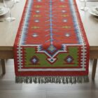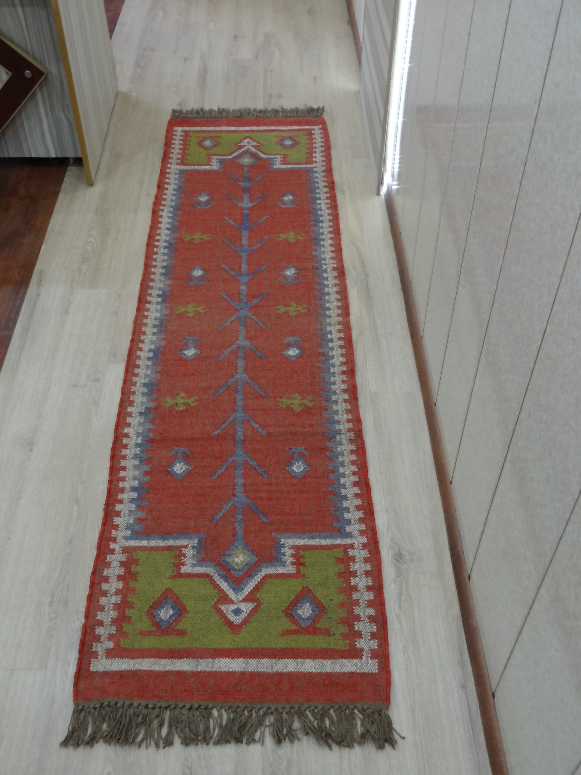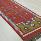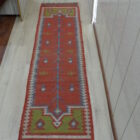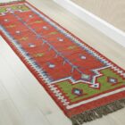 This beautiful kilim features a traditional design and is hand made using a selection of Jute and wool. It consists of a variety of different coloured fabric with a fringed edging to produce a wonderful unique item.